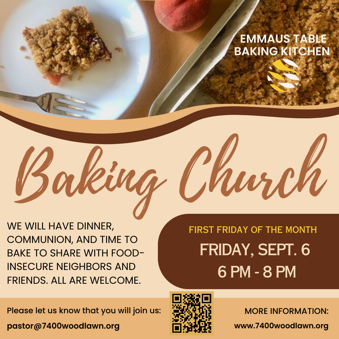 Emmaus Table gathers for communion and other activities. For details about gatherings and to receive updates, please complete the form below or email pastor@7400Woodlawn.org.